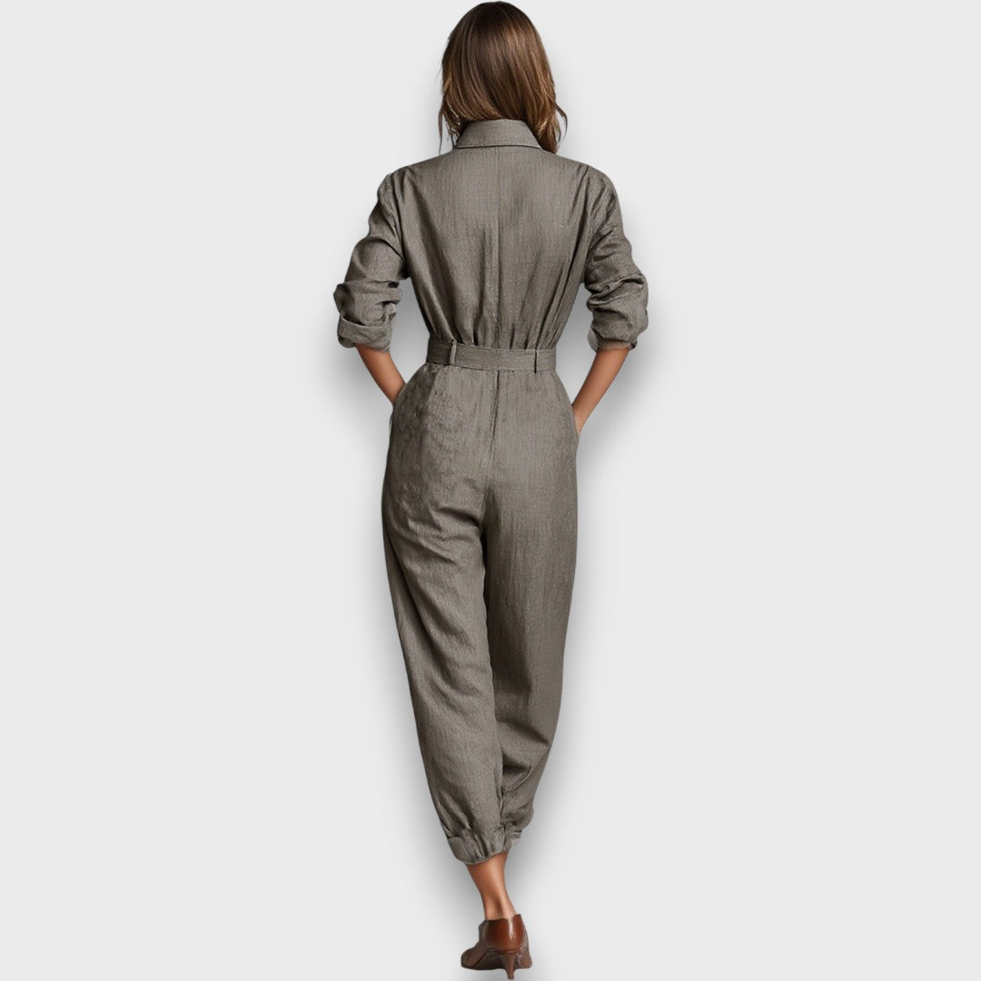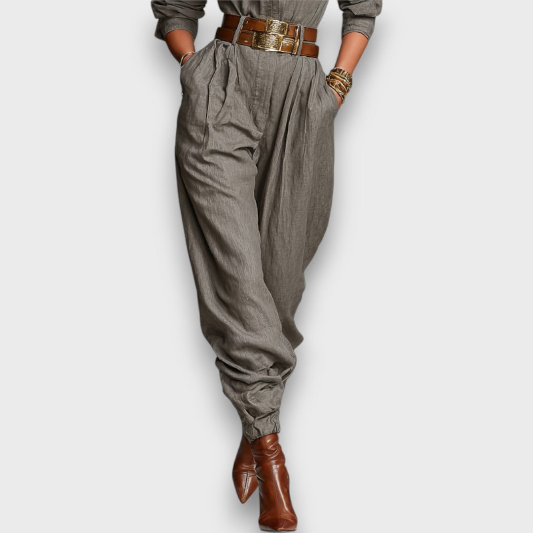 Ein Ensemble, das Stärke und Weiblichkeit zugleich verkörpert: Dieses zweiteilige Set mit Hemd und Hose in fließender Passform bringt Eleganz und Komfort in Einklang. Die langen Ärmel, der markante Kragen und die betonte Taille verleihen dem Look einen modernen Utility-Touch, während die lockere Silhouette für Bewegungsfreiheit sorgt.