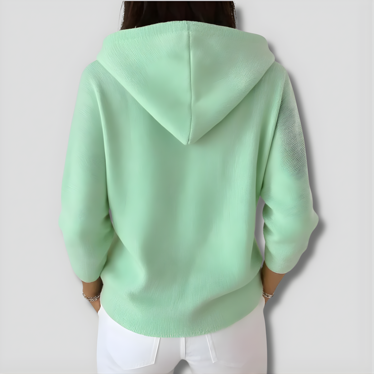 - Designdetails: Kapuze, durchgehende Knopfleiste, feine Stricktextur.